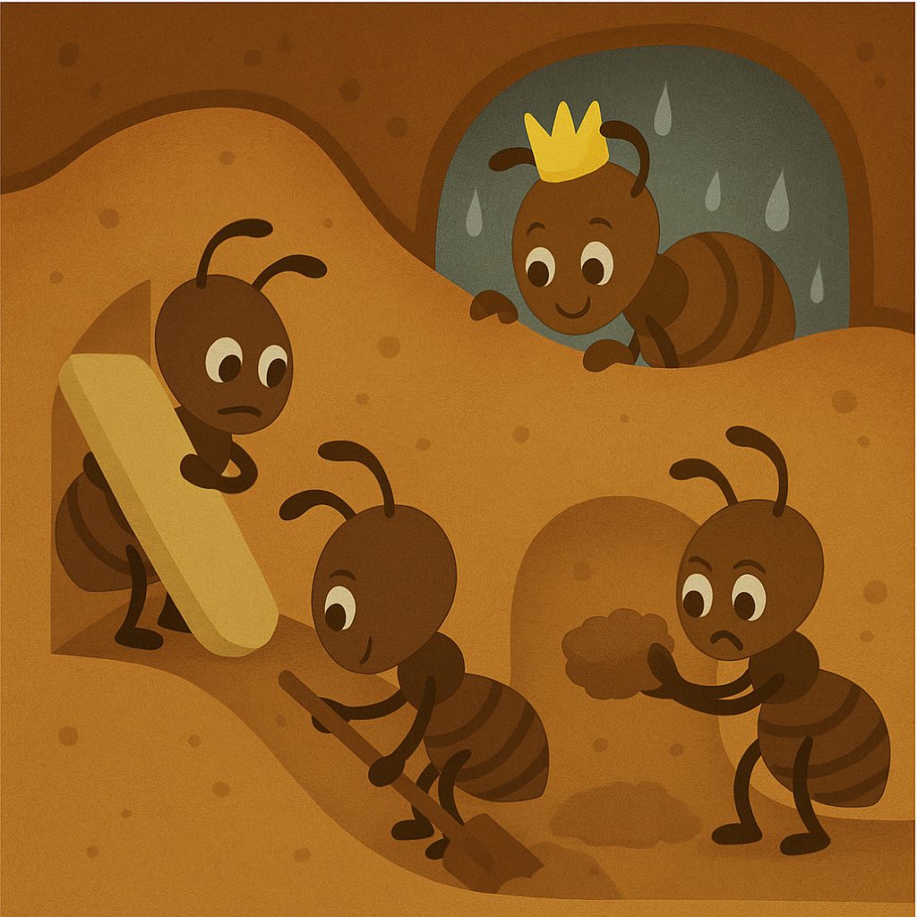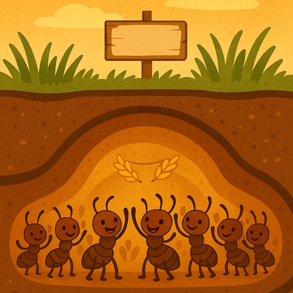 ولكي لا يتعب أحد، علّمتهم المهندسة نَمْلة إيقاع العمل: دقيقتان للحفر، ثم تبديل المواقع، ثم راحة قصيرة قبل العودة من جديد. كان العمل يشبه أغنيةً جماعيةً متناغمة، تُغنّيها النملات وهنّ يبنين بيوتهن بحماس.