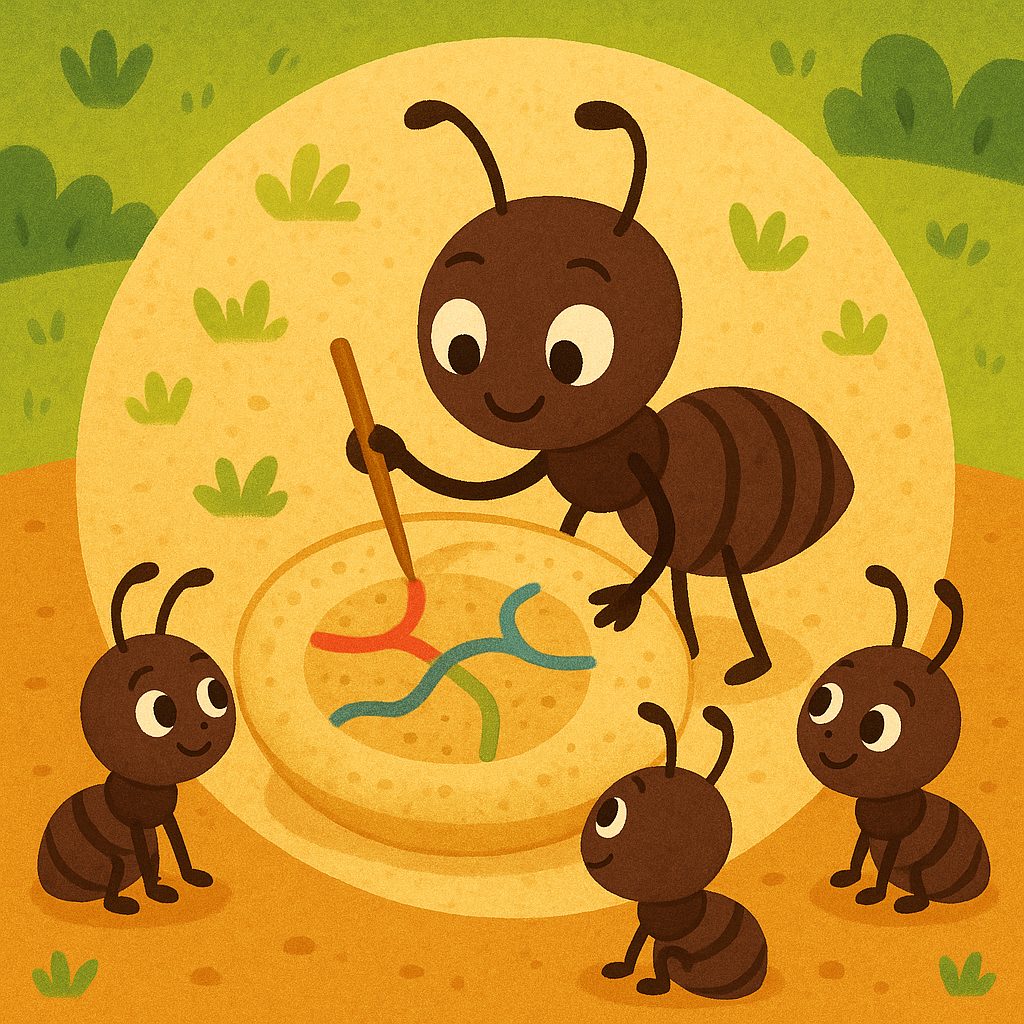 جمعت المهندسة نملة مجلسًا صغيرًا في ظل ورقةٍ خضراء كبيرة، وجلست مع صديقاتها حول بقعة صغيرة من الرمل فرشتها كأنها لوح رسم. بأطرافها الدقيقة بدأت ترسم خرائط مصغّرة لقرية النمل: المدخل، نفق الهواء، قاعة الأمهات، مخزن الحبوب، غرفة المطر، وممر الطوارئ.