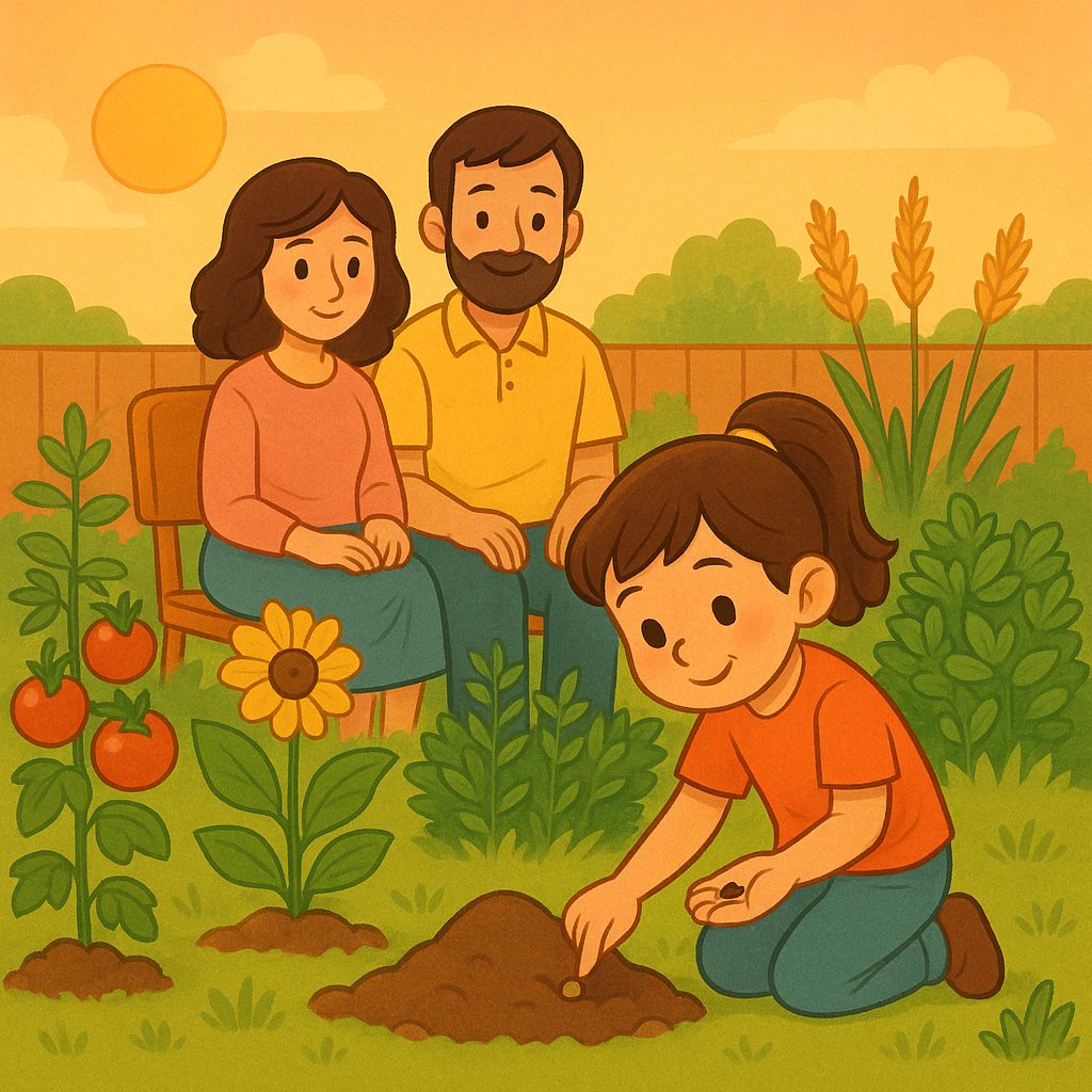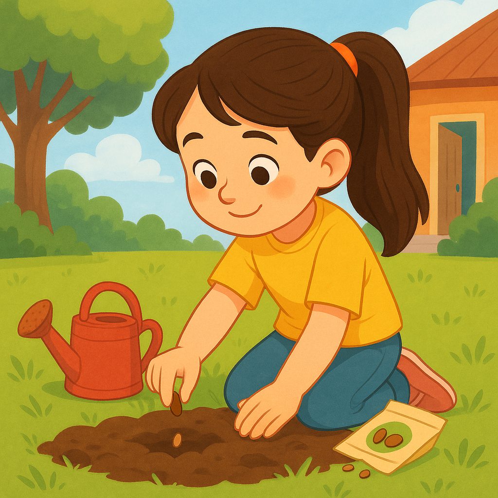 وبتوجيه من الأب، حفرت مرح حفرًا صغيرة في التربة، ووضعت البذور فيها برفق ثمّ غطتها بالتراب. حرصت على أن تضع كلّ مجموعة من البذور المتشابهة قريبة معًا حتى لا تشعر البذور بالوحدة، ثمّ سقتها بالماء وتركتها.