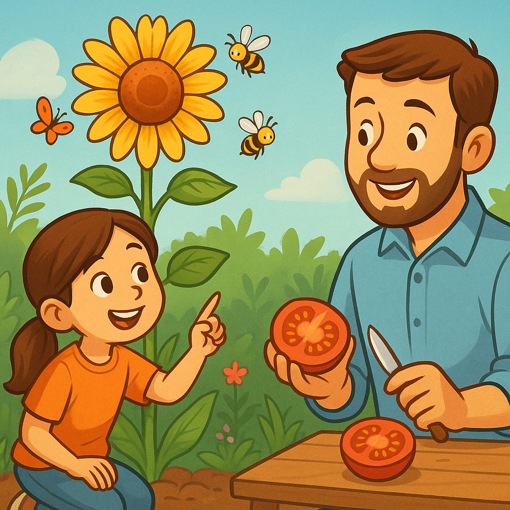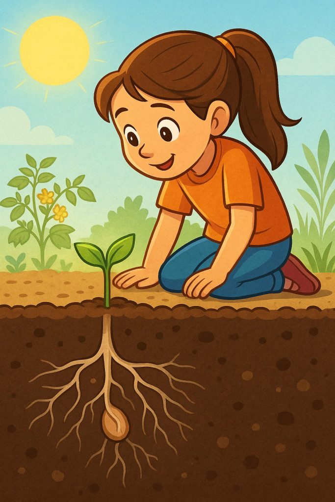 _ لقد فهمتُ الآن حكاية البذرة من البداية: أولًا: تكون بذرة صغيرة نائمة، نضعها في التربة ونغطيها لتشعر بالدفء، ونسقيها، فتشرب الماء وتستيقظ، ويخرج منها جذر إلى الأسفل، وساق وأوراق إلى الأعلى… تكبر وتكبر حتى تُخرج أزهارًا جميلة، ثم تتحول الأزهار إلى ثمار أو حبوب، فيها بذور جديدة.