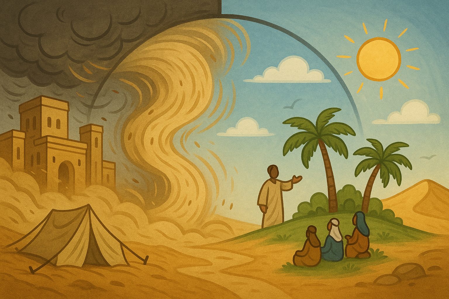 أما هود عليه السلام ومن آمن معه، فقد أنجاهم الله برحمته. كانوا في مكانٍ آمنٍ بعيد عن الرياح، يسمعون صوت العاصفة من بعيد ولا تمسّهم بسوء، لأنهم صدّقوا نبيهم وآمنوا بربهم.