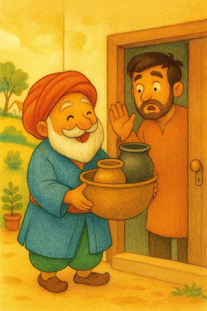 “يا جاري العزيز… بشّرك الله بالخير! قِدرُكَ الكبيرة ولدت عندي قدرًا صغيرة، ومن الأمانة أن أعيدهما إليك معًا.”