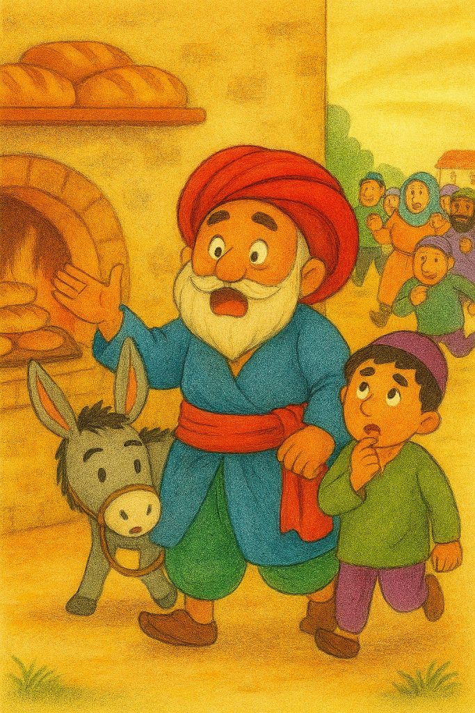 ثمّ انطلق مبتعدًا، هو وحماره، فيما راح الناس يحدّقون فيه مذهولين، يتضاحكون من تغيّر رأيه المفاجئ…