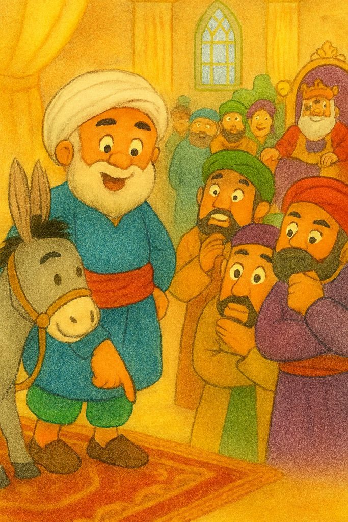 عندما وصل الخبر إلى جحا، ارتدى أجمل ثيابه، وربط على رأسه عمامة بيضاء ليبدو وقورًا، ثم امتطى حماره وتوجّه إلى القصر بخطوات واثقة.
