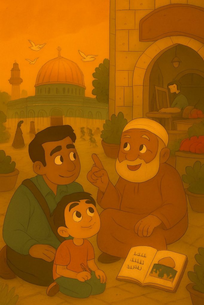 واصل سليم السير مع والده بين الأزقة حتى وصلا إلى ساحة واسعة يغمرها نور العصر. هناك، وقف سليم مبهورًا، وقد اتسعت عيناه دهشة، وأمامه استقرّ المسجد الأقصى بكلّ جماله.