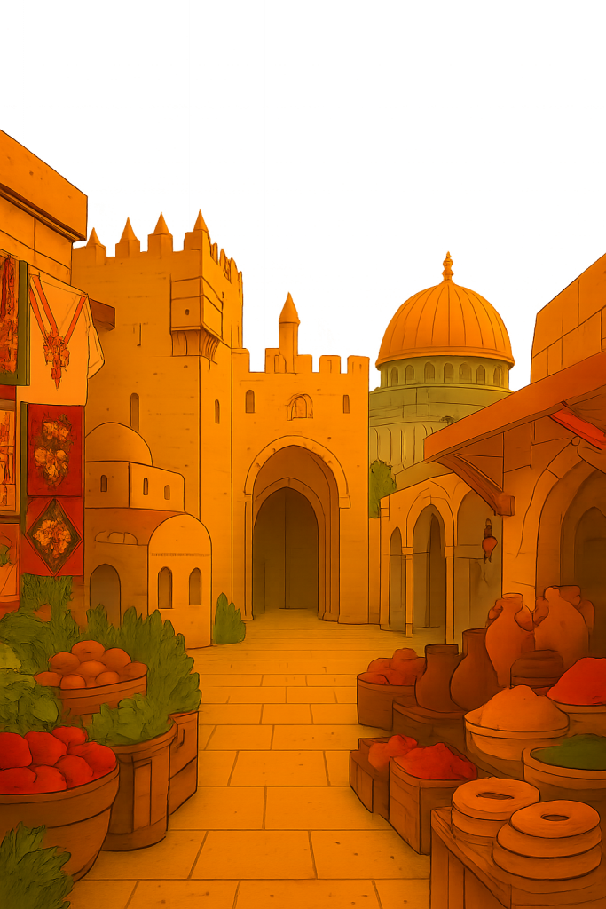بعد أن فرغ سليم ووالده من جولتهما في الساحة، اتجها إلى السوق القريب من المسجد الأقصى ليستريحا. كان السوق نابضًا بالحياة: دكاكين صغيرة متلاصقة، بسطات مليئة بالفاكهة والبهارات، وباعة ينادون بمرح يجذب المارة. رائحة القهوة الطازجة امتزجت مع رائحة الخبز والكعك بالسمسم، فحاول أنف سليم التقاطها كلها بحماس!
