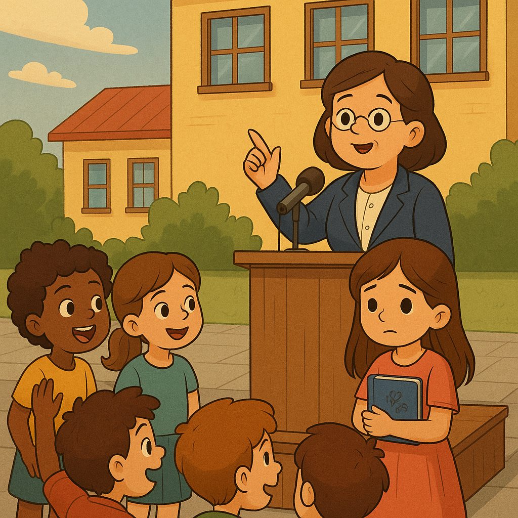 في صباحٍ ربيعي مشرق، اجتمع الطلاب في ساحة المدرسة ليستمعوا إلى إعلان مهم من إدارة المدرسة، كانت العصافير تزقزق من فوق الأشجار، والهواء يحمل رائحة زهور البرتقال. وقفت المديرة على المنصّة بابتسامة وقالت: