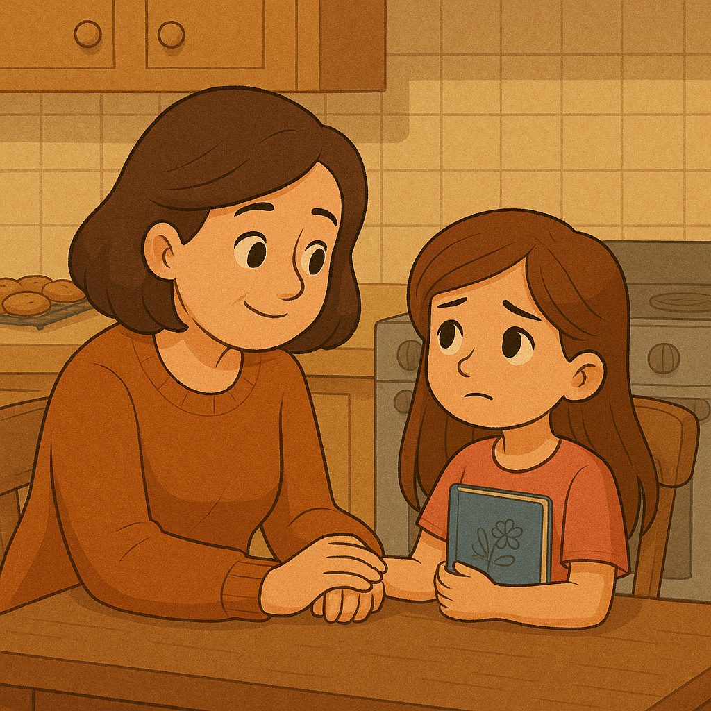 جلست الأم قربها، ابتسمت وربّتت على كتفها وقالت: