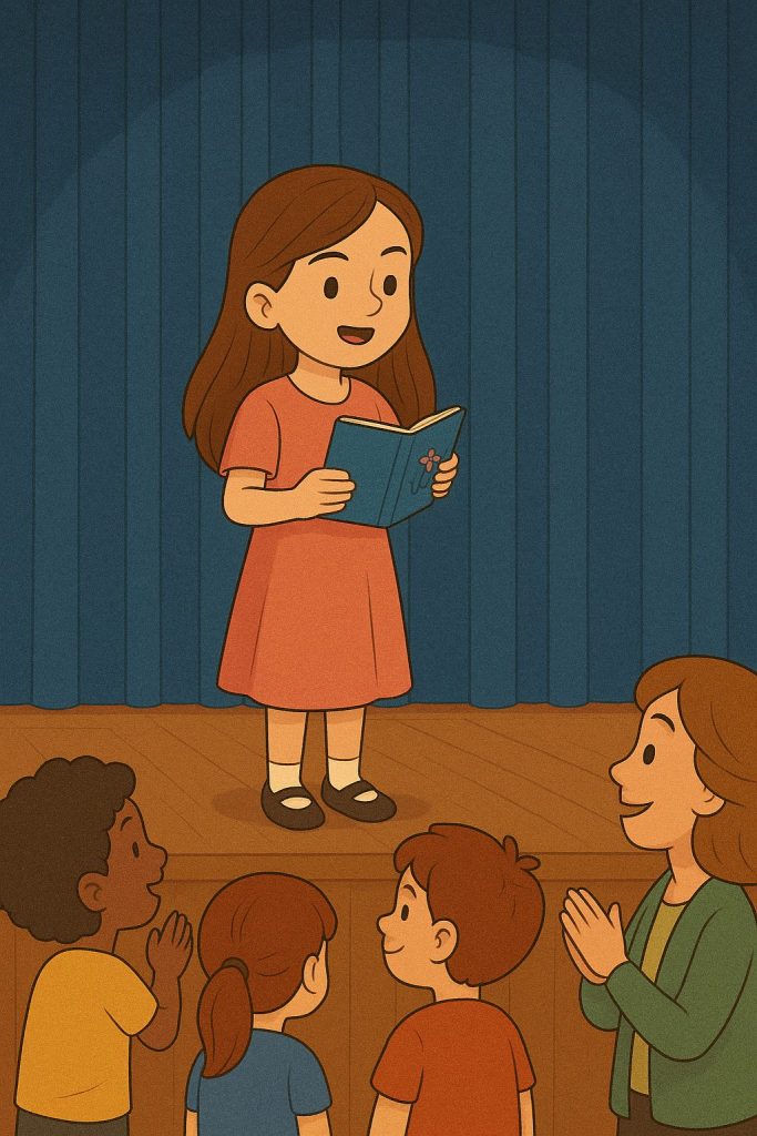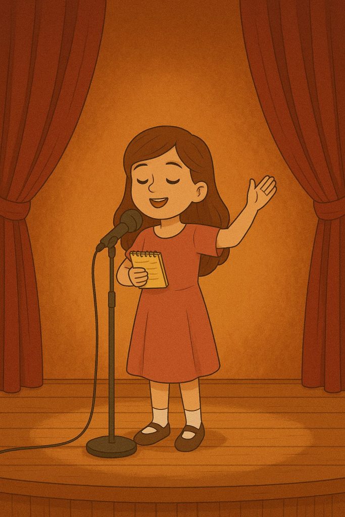 تقدّمت بخطوات بطيئة نحو المسرح. الأضواء بدت قوية، والوجوه الكثيرة أمامها جعلت قلبها يسرع أكثر... للحظة، كادت أن تهرب، لكنها تنفّست بعمق، ثم بدأت تقرأ: