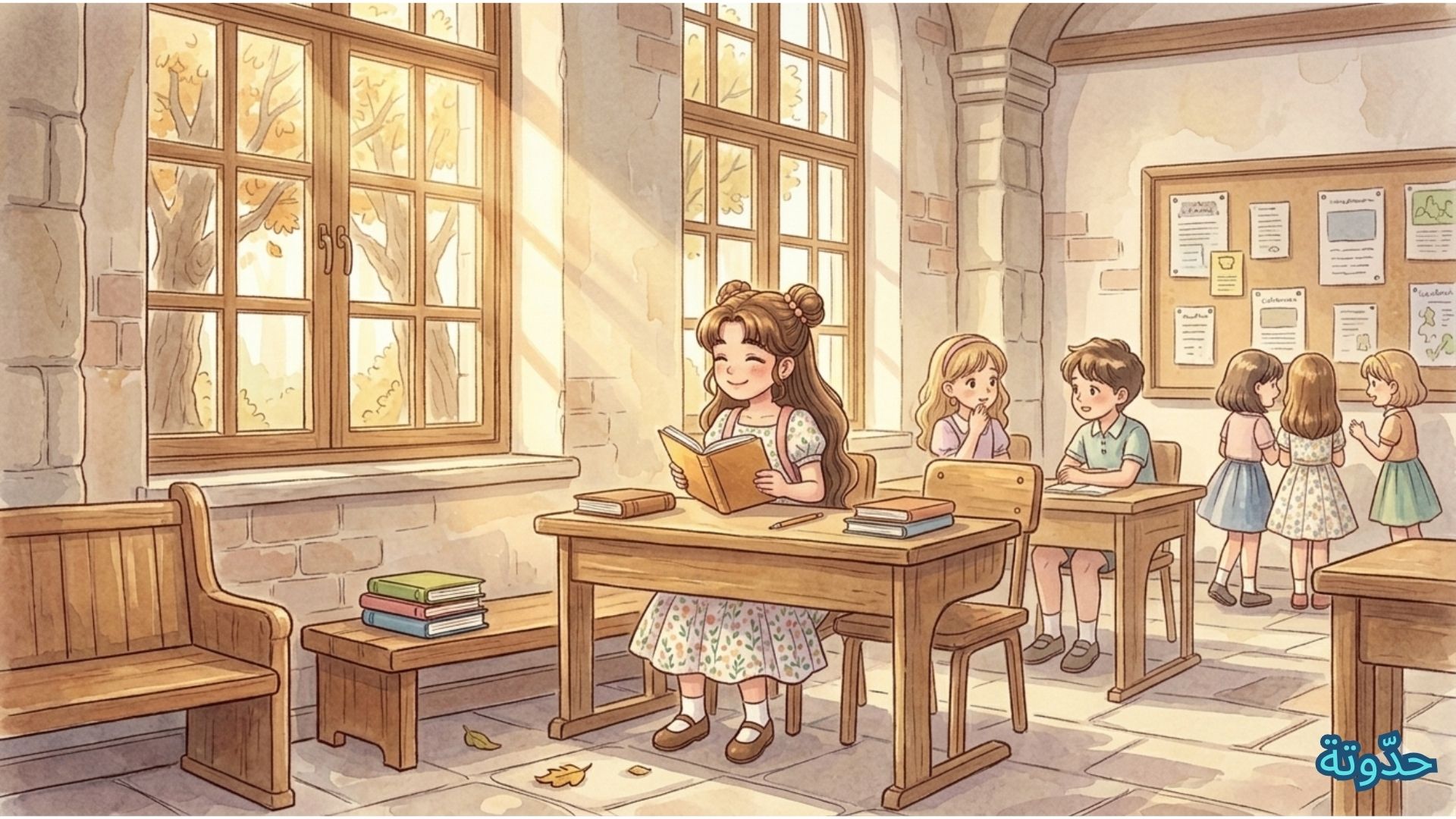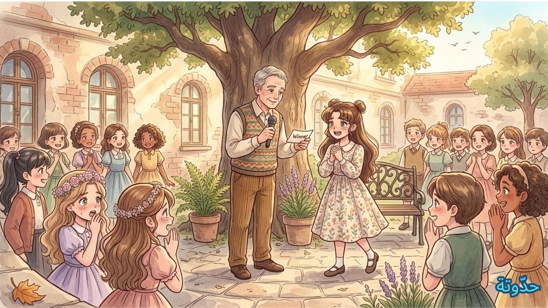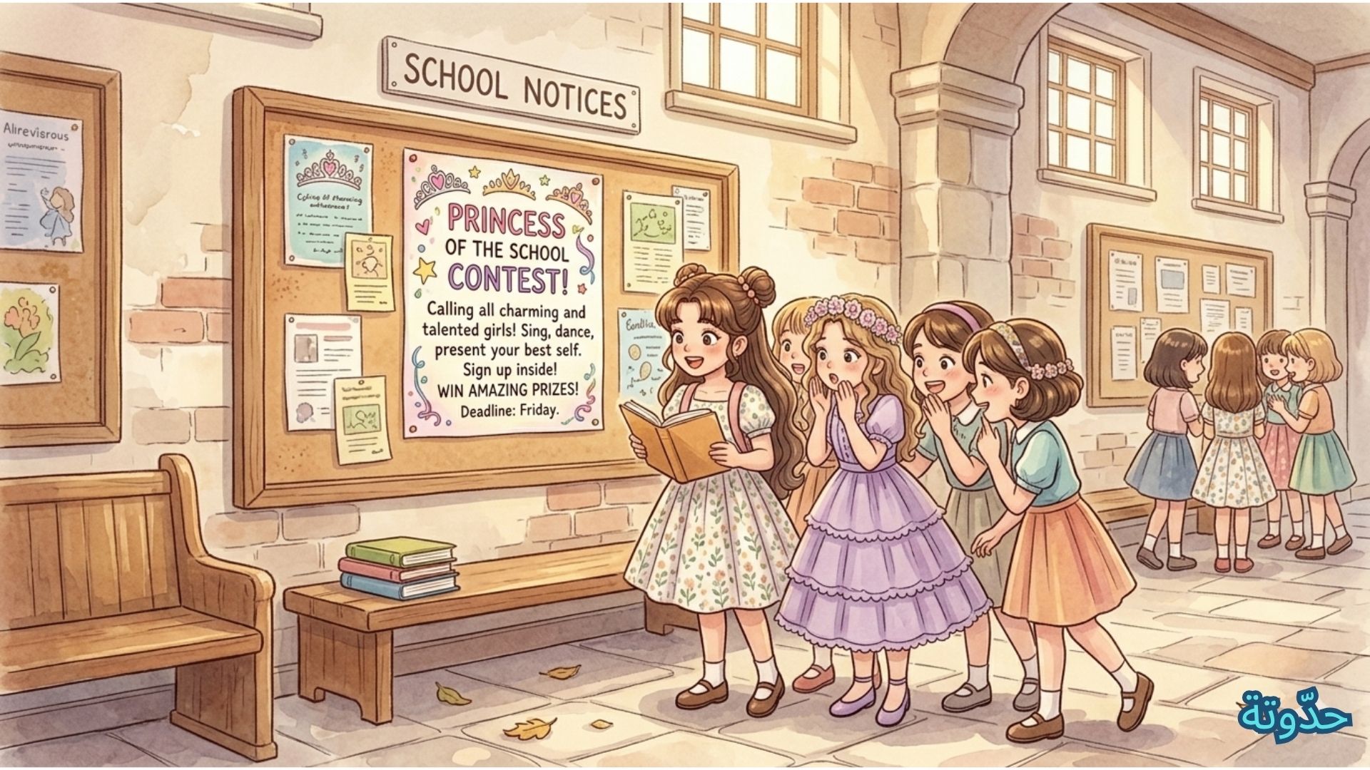 سلمى، الطالبة الهادئة في العاشرة من عمرها، قرأت الإعلان بصمت وفضول… كانت تحبّ القراءة كثيرًا، ولا تميل إلى لفت الانتباه، عادت إلى صفّها دون أن تتكلّم محتفظة بابتسامتها الهادئة، وهي تفكر في المعنى الحقيقي للقب.