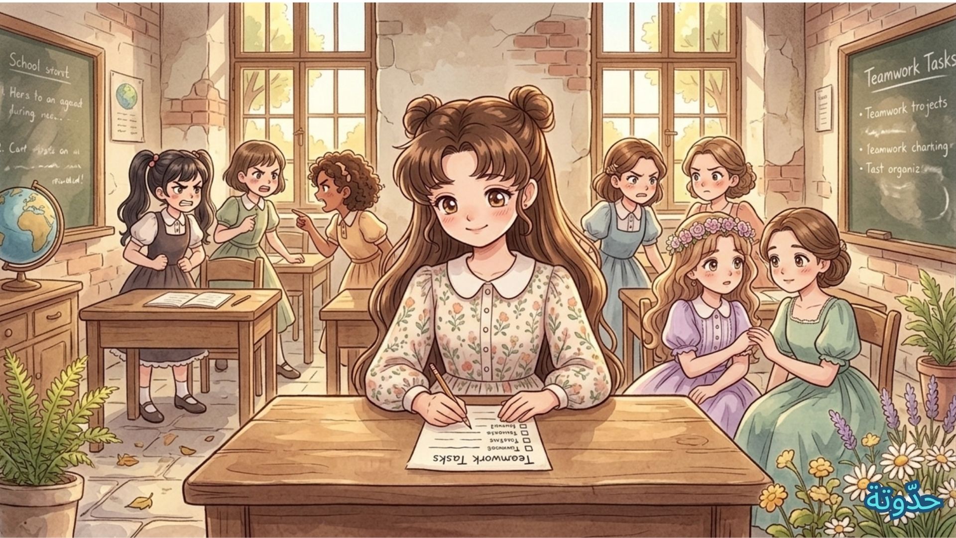 تنهدت سلمى وقالت بهدوء: "دعونا نقسّم الأدوار بشكل منظم، كل واحدة تعرف مهمتها، وسنساعد بعضنا بعضًا إن احتجنا." بدأت تكتب النقاط، وتقترح الحلول، وتساند من تتأخر، دون رفع صوتها أو فرض رأيها بالقوة… تدريجيًّا، بدأ الجميع يتعاون.