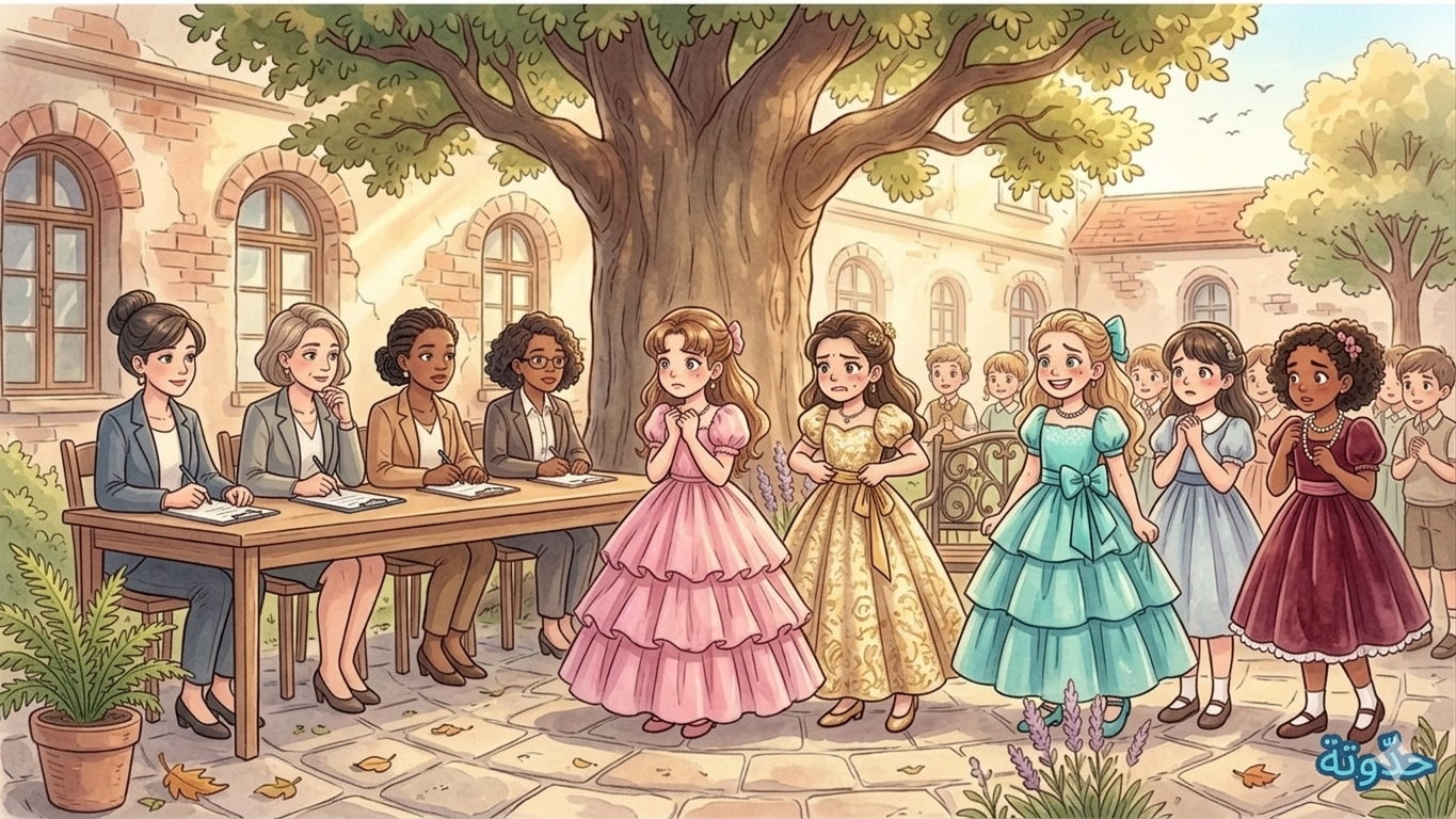 حلّ يوم المسابقة، وجلست لجنة من المعلمات في الساحة لمتابعة الطالبات… ارتفعت أصوات التوتر بين الطالبات اللواتي يحاولن إظهار أنفسهنّ أمام اللجنة بفساتين مبهرجة ومبالغ فيها.