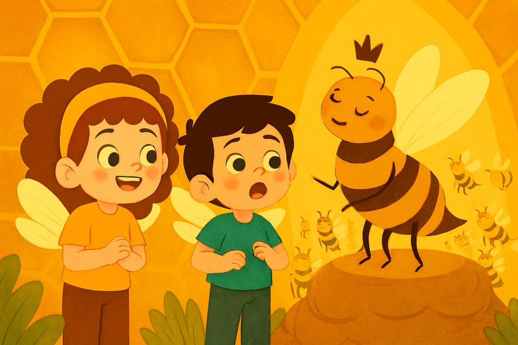 ودخلوا القاعة، فرأوا الملكة أكبر حجمًا من باقي النحل، جناحاها يلمعان كالحرير، تحيط بها الحارسات. كانت جميلة ومهيبة، تتحرك ببطء لكن بثقة.