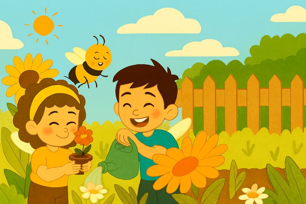 طار الثلاثة معًا فوق الحديقة، وكل شيء بدا ضخمًا أمام الطفلين بحجمهما الجديد. بدت لهما الزهور كغابات ملوّنة، والندى على أوراقها لآلئ ضخمة، وأصوات الطيور صارت كالرعد. كان الطيران ممتعًا جدّا، والهواء يحملهما بخفّة فيزيد إحساسهما بالفرح والمتعة.