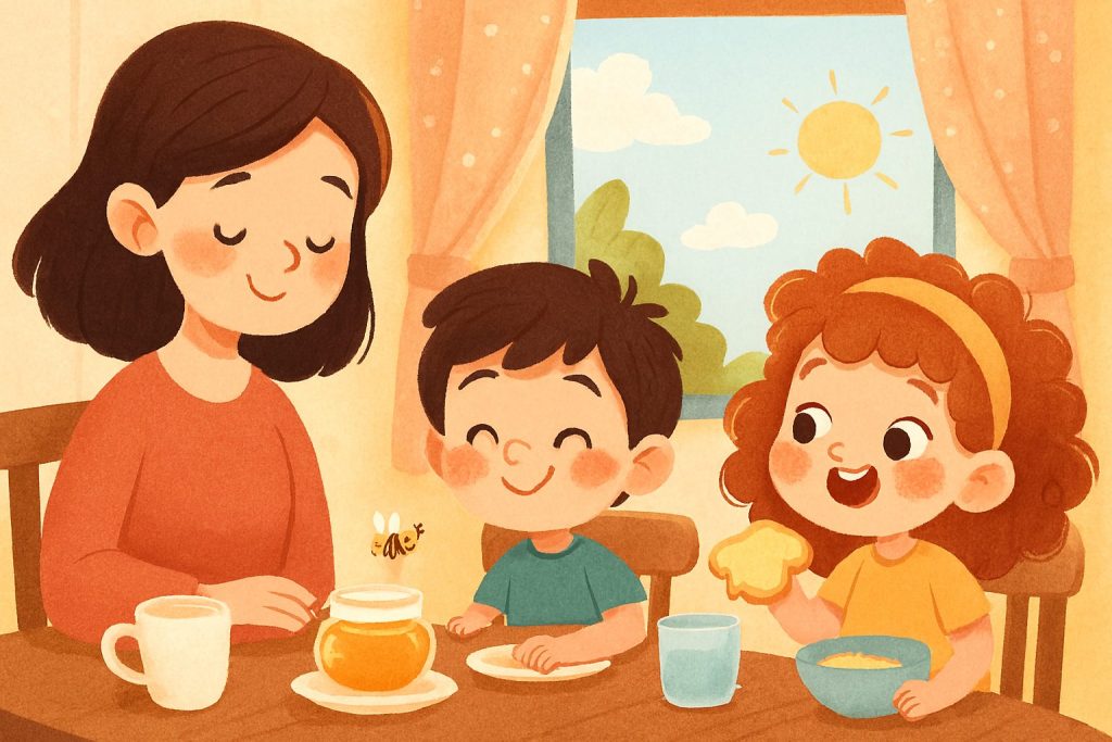 كان صباحًا دافئًا والنسيم يتسلل عبر نافذة المطبخ، جلست ليان وأخوها آدم مع أمّهما إلى مائدة الإفطار. وضعت الأمّ أمامهما طبقًا صغيرًا من العسل الذهبي اللامع، يلمع كأنه ذهب سائل. غمست ليان قطعة من الخبز في العسل وتذوّقت الطعم الحلو وقالت وهي تضحك: