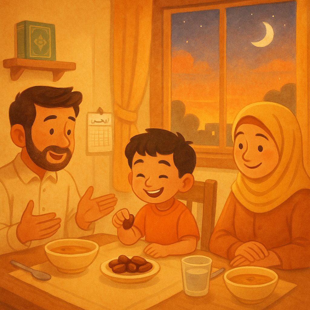 في البيت، كانت رائحة الحساء الدافئ والخبز الطازج تملأ المكان وتداعب الأنف. وضعت الأمّ التمر والماء على المائدة بحب، بينما رتّب الأب الأكواب والأطباق وهو يبتسم.