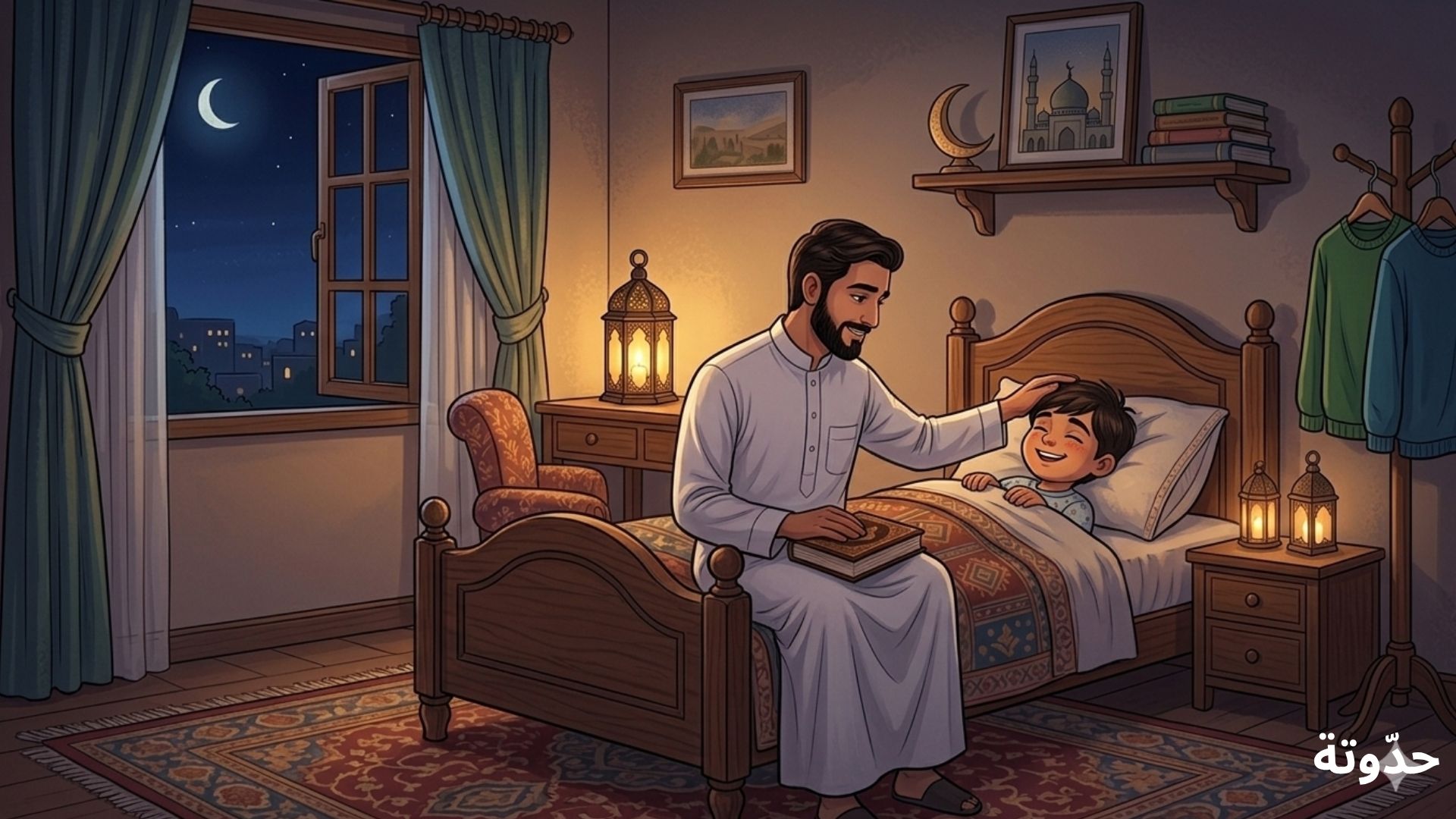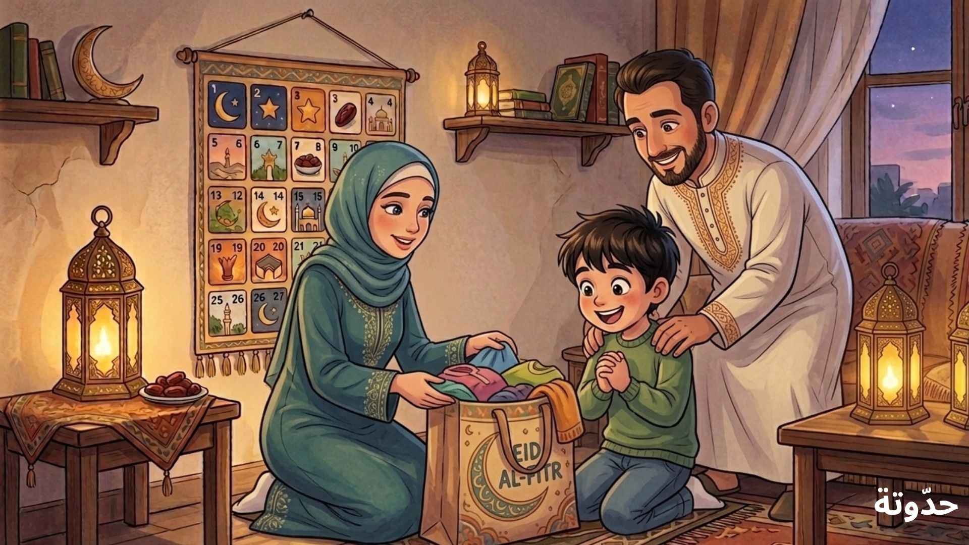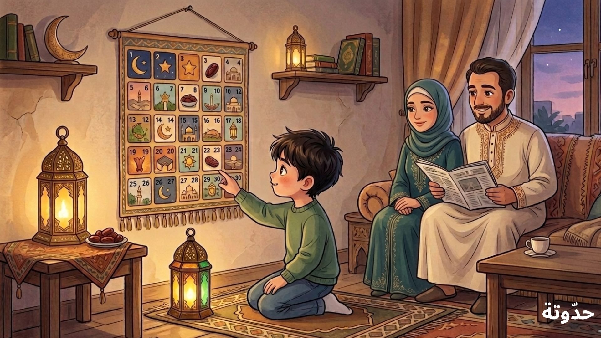 جلس عمر على السجادة في غرفة الجلوس، ينظر إلى التقويم الرمضاني المعلّق على الحائط. اقترب منه والده وسأله مبتسمًا:
