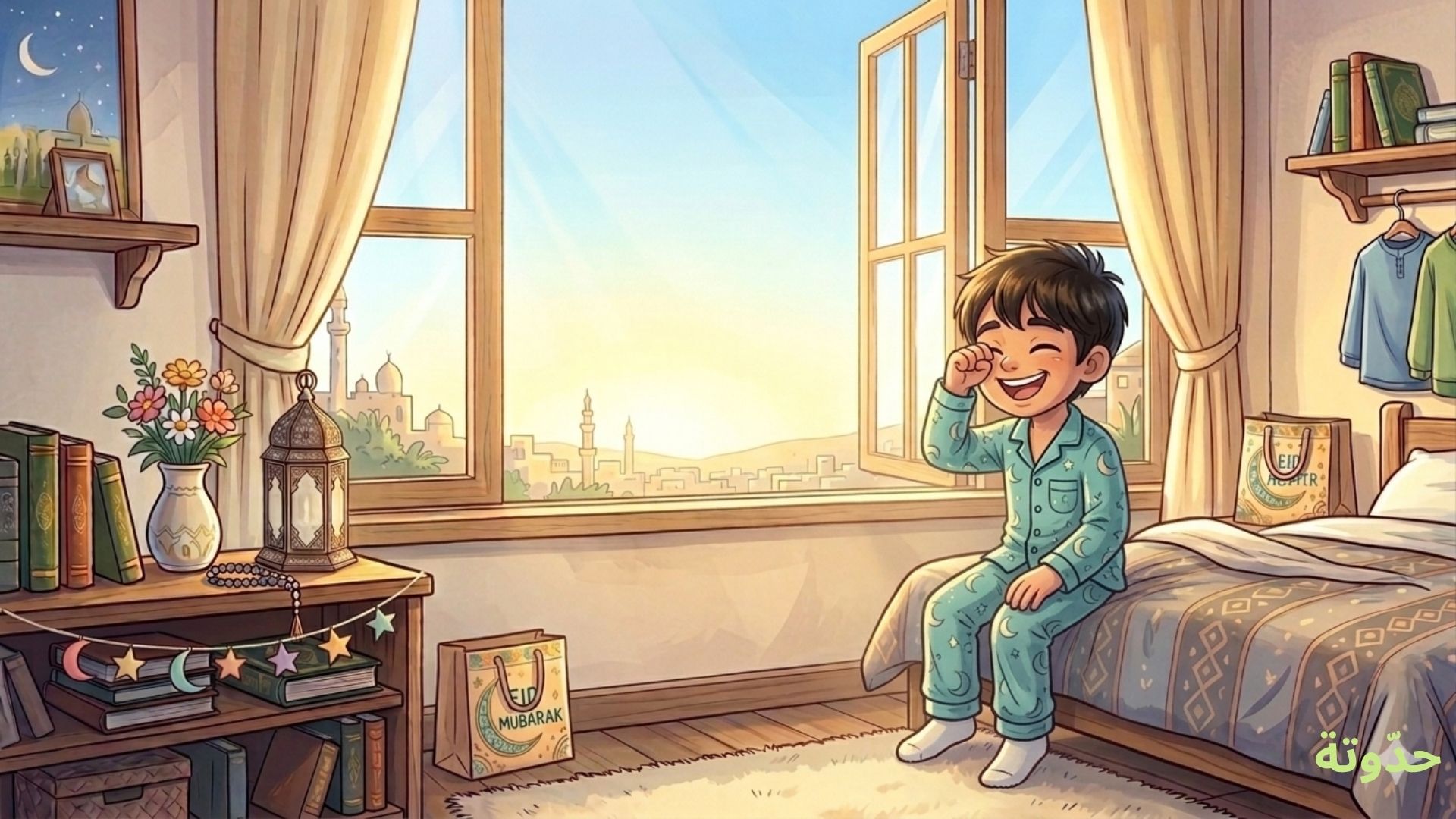 فتح عمر عينيه بسرعة، وشعر بطاقة غريبة تملأ قلبه. نهض من سريره، وتذكّر ما قاله والده أمس. دخل الحمّام، واغتسل، ثم ارتدى ثوب العيد الجديد.