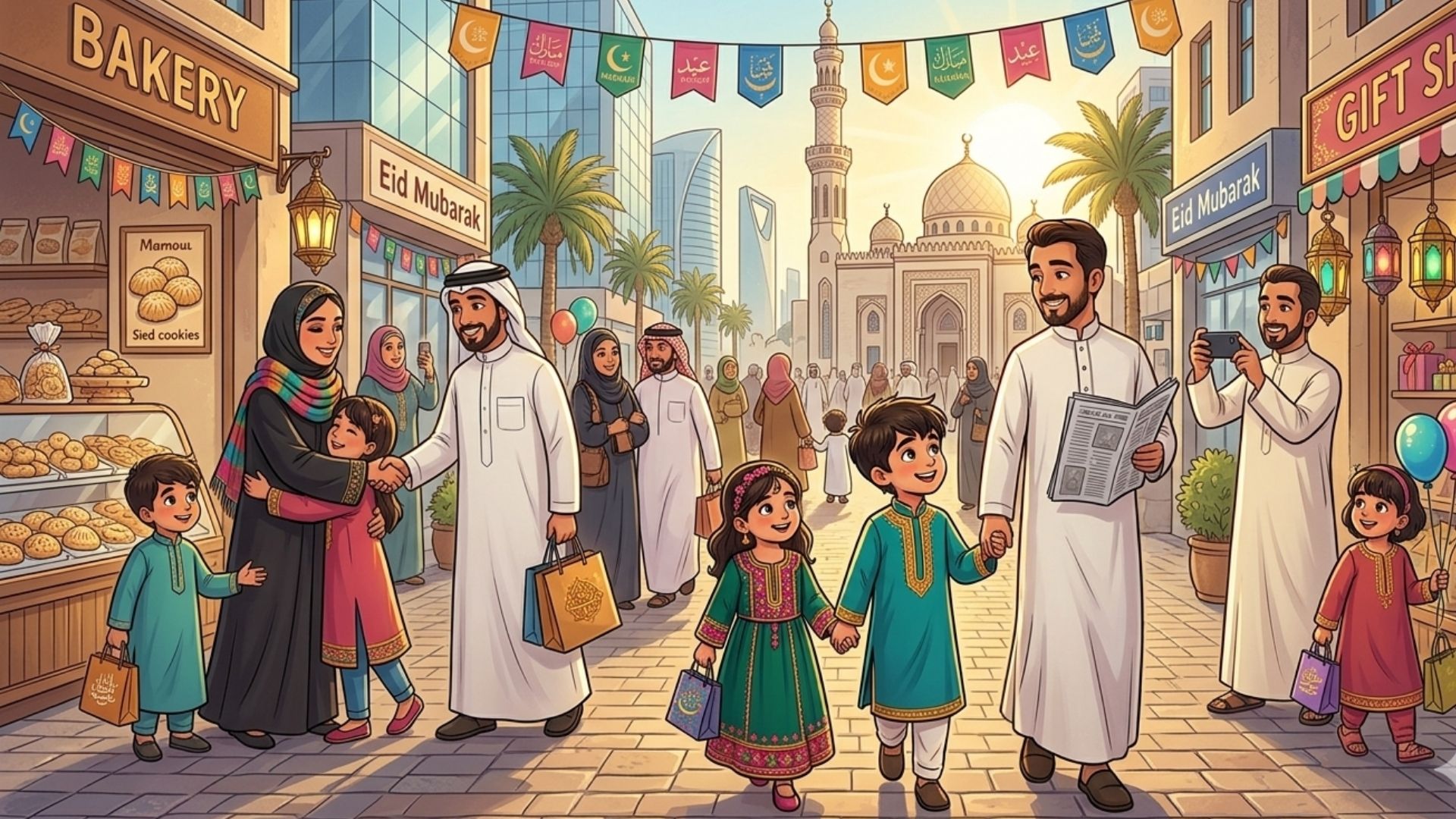 بعد الإفطار، خرج عمر مع والده لزيارة الأقارب. في كل بيت، كان يسمع ضحكات، ويرى أطباق الحلوى، ويتبادل التهاني.