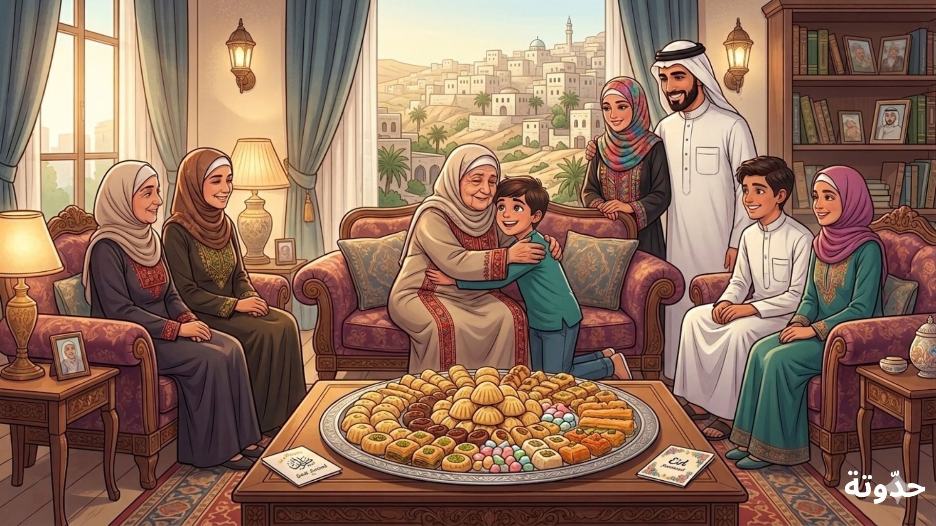عاد إلى البيت، وهناك كانت رائحة المعمول والكعك تملأ المكان… جلست الجدة في صدر الغرفة، تستقبل الجميع بابتسامتها الدافئة.